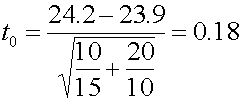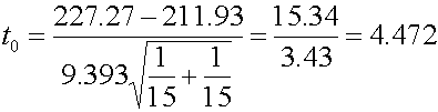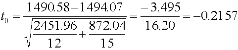 นั่นคือ ถ้า a=0.10 เราจะปฏิเสธสมมติฐานหลัก H0 : m1=m2 ถ้า t0 > ta/2,df หรือถ้า t 0< - ta/2,df จากตาราง t จะได้ t0.05,16=1.746 6. คำนวณหาค่า t0 จาก