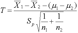 เมื่อเป็นเช่นนี้ ค่า D ก็จะเป็น Interval และค่าจะมีลักษณะเป็น t- Distribution ดังนั้นเมื่อเราจะทดสอบสมมติฐานความแตกต่างของ m1และ m2 เราจะกระทำผ่านผลต่างดังกล่าว ว่ามีค่าไม่เท่ากับ 0 อย่างมีนัยสำคัญหรือไม่นั่นเอง ถ้าสมมติมีข้อมูลที่มีการกระจายแบบปกติ (Normal) อยู่สองข้อมูลที่ไม่รู้ค่าที่แท้จริงของ m1และ m2 ในขณะที่ไม่รู้ค่าที่แท้จริงของ s21และ s22 รู้แต่ว่า s21=s22 เราต้องการทดสอบสมมติฐาน