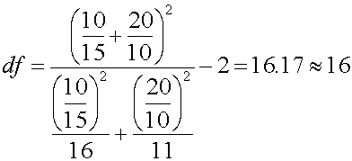 หากใช้ Analysis Tools ของ MS-Excel โดยต้องเลือก t-Test: Two-Sample Assuming Unequal Variances จะให้ผลดังนี้