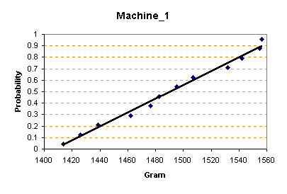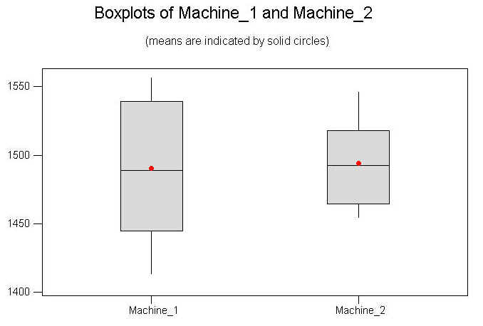 จากผลลัพธ์เมื่อใช้ Minitab ค่า P-Value มากกว่า a (0.10) เราจึงยอมรับสมมติฐานหลัก H0 : m1=m2 ่ทั้งนี้เมื่อเราทำการแสดงค่าของข้อมูลทั้งสองกลุ่มออกมาในรูป Box plot เราจะเห็นว่า ค่าเฉลี่ยใกล้เคียงกันมาก แต่ การกระจายของข้อมูลกลับแตกต่างกัน แต่เนื่องจากว่า t Test ไม่สามารถใช้พิสูจน์ความแตกต่างกันของค่าการกระจายของข้อมูลได้ ผู้ทำการวิเคราะห์ข้อมูลจึงจำเป็นต้องพิจารณาผลที่ได้ อย่างกรณีตัวอย่างนี้ แม้ผลจะสรุปว่าค่าเฉลี่ยไม่แตกต่างกัน แต่ภาพที่เรามองเห็นนั้นกำลังบอกว่า Machine 1 น่าจะได้รับการแก้ไขในบางอย่าง