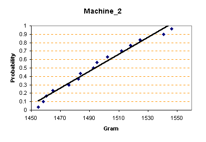 หากใช้โปรแกรม Minitab จะให้ผลดังนี้ Two-sample T for Machine_1 vs Machine_2 N Mean StDev SE Mean Machine_1 12 1490.6 49.5 14 Machine_2 15 1494.1 29.5 7.6 Difference = mu Machine_1 - mu Machine_2 Estimate for difference: -3.5 90% CI for difference: (-31.7, 24.7) T-Test of difference = 0(vs not =): T-Value = -0.22 P-Value =0.832 DF=17