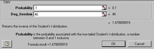 (เนื่องจาก MS Excel จะมอง Probability เป็น a/2 เสมอ ดังนั้นเมื่อเราทดสอบด้านเดียว หรือ One-tailed test ค่า a ที่ใส่ต้องเอา 2 คูณก่อน) โดยใช้ Minitab ได้ค่าเท่ากับ -1.678 หรือ 1.678 แล้วแต่กรณีของ Alternative hypothesis Inverse Cumulative Distribution Function Student's t distribution with 46 DF P( X <= x ) x 0.0500 -1.6787