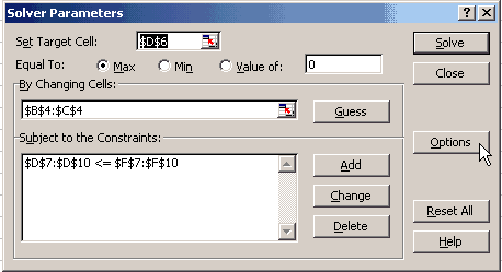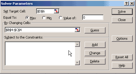 5. ในช่อง Set Target Cell ให้ ใช้เม้าส์ Click ตรงลูกศรสีแดงขวามือของช่อง จะปรากฏแทบใส่ข้อมูล ให้ Click เม้าส์ ที่ Cell D6 หรือพิมพ์ดังที่ปรากฏในรูป 6. Equal To ให้ Click ที่ Max (เพราะโจทย์ข้อนี้ให้หา Maximum) 7. By Changing Cells: ความหมายก็คือ ให้ระบุ ตำแหน่งที่จะให้ Solver นำค่า Optimal point มาใส่ไว้ หลังจากทำการวิเคราะห์เสร็จแล้ว จากข้อมูลที่เราทำไว้ และเว้นไว้ ให้กดเม้าส์ที่ลูกศรสีแดงของช่องนี้ เมื่อปรากฏแถบให้ใส่ข้อมูล ก็เลื่อนเม้าส์ไปที่ Cell B4 กดปุ่มซ้ายของเม้าส์ค้างไว้ แล้วลากมาที่ Cell C4 แล้วปล่อยมือที่กดเม้าส์ หรือสามารถพิมพ์โดยตรงดังที่ปรากฏในรูปเลยก็ได้ 8. Subject to the Constraints: เป็นการระบุตัวเลขจากสมการ Constraints ต่างๆ จากรูปข้างบน ให้กด Add จะปรากฏ Window ใหม่ดังรูปต่อไปนี้