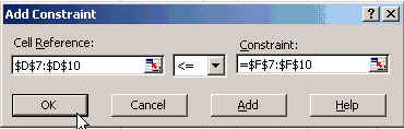 จากรูป ช่องตรงกลางเราสามารถเปลี่ยนจาก <= ไปเป็น = หรือ => ก็ได้แล้วแต่โจทย์ ในข้อนี้เราใช่ <= Cell Reference : หมายถึง Cell ที่เก็บผลลัพธ์ของสมการ Constraints ทั้งหมดไว้ ในที่นี่ก็คือ Cell D7, D8 , D9 และ D10 ให้กดเม้าส์ที่ลูกศรสีแดงขวามือของช่อง เมื่อปรากกช่องใส่ข้อมูล ให้ Click เม้าส์ที่ D7 กดปุ่มซ้ายของเม้าส์ค้างไว้ แล้วลากมาจนถึง Cell D10 Constraints : ก็คือข้อจำกัด จากข้อมูล ก็คือตัวเลขใน Cell F7 จนถึง F10 นั่นเอง ให้กดเม้าส์ที่ลูกศรสีแดงขวามือของช่อง เมื่อปรากกช่องใส่ข้อมูล ให้ Click เม้าส์ที่ F7 กดปุ่มซ้ายของเม้าส์ค้างไว้ แล้วลากมาจนถึง Cell F10 หลังจากใส่ข้อมูลครบแล้ว ก็ให้กด OK ก็จะปรากฏ Window ดังรูปต่อไปนี้