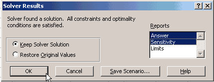 ในช่องขวามือสุด ให้เลือกชนิด Report เป็น Answer และ Sensitivity แล้วกดปุ่ม OK 12. หลังจากนั้น Excel จะสร้าง Report sheet เพิ่มขึ้นมาให้อีก 2 sheet พร้อมทั้งใส่ตัวเลขที่เหลือใน Sheet แรกที่เราสร้างขึ้นมาเพื่อใส่ข้อมูล (ถูกเปลี่ยนไปเป็น Sheet ตำแหน่งที่ 3 แล้ว)