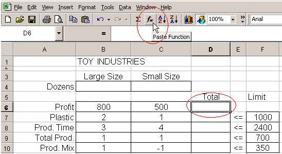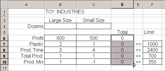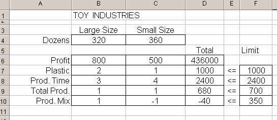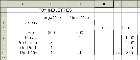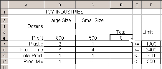 การวิเคราะห์ Linear programming โดยโปรแกรม Microsoft Excel การจะทำการวิเคราะห์ Linear Programming ได้นั้นมีหลายวิธี แต่เนื่องจากในปัจจุบัน คอมพิวเตอร์เข้ามาช่วยได้มากในการคำนวณ โดยเฉพาะอย่างยิ่งโปรแกรม Microsoft Excel นั้นเป็นที่แพร่หลายเป็นอย่างมากสำหรับผู้ใช้ คอมพิวเตอร์ ยิ่งเฉพาะในเมืองไทย ดังนั้นเรามาเรียนรู้โดยการใช้ Microsoft Excel ในการวิเคราะห์ โดย MS Excel มีชุดสำหรับการวิเคราะห์ Maximize / Minimize ที่เป็น Linear ที่เรียกว่า Solver ให้ใช้ ซึ่งท่านสามารถเข้าไปดูขั้นตอน Solver Add-ins ได้ ในการนี้ ผู้เขียนจะอนุมานว่าท่านผู้อ่านหัวข้อนี้ มีความเข้าใจและใช้งาน Microsoft Excel พอสมควร และโดยเฉพาะอย่างยิ่ง Function ทางคณิตศาสตร์ของ EXcel ที่ผู้เขียนจะกล่าวถึงต่อไปในหัวข้อนี้ โดยตัวอย่างก็จะอ้างถึงตัวอย่างในหัวข้อ การวิเคราะห์โดยใช้กราฟ ซึ่งมีสมการดังต่อไปนี้ Maximize 800L + 500S (รายได้สูงสุด ต่อสัปดาห์) Constraint 2L + S <= 1000 (วัตถุดิบ พลาสติก) 3L + 4S <= 2400 (เวลาในการผลิตใน 1 สัปดาห์) L + S <= 700 (ผลิตรวม) L - S <= 350 ( ความหลากหลายของ ผลิตภัณฑ์) L , S >= 0 ( Nonnegativity)