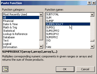 - หน้าต่างด้านซ้ายมือ เลือก All ด้านขวามือเลือก SUMPRODUCT แล้วกด OK
