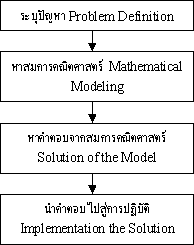 Mathemetical Modeling หลายๆครั้งที่ผู้บริหารจำเป็นต้องตัดสินใจในปัญหา ซึ่งการที่จะตัดสินใจอย่างใดอย่างหนึ่งได้ ผู้บริหารจำเป็นต้องมีทางเลือก ซึ่งอาจจะเป็นสองหรือมากกว่าก็ได้ ดังนั้นการจะตัดสินใจเป็นอย่างไรผู้บริหารจึงจำเป็นต้องใช้ข้อมูลเชิงปริมาณ ที่สามารถเปรียบเทียบเชิงตัวเลขได้ จึงจำเป็นต้องมีการนำข้อมูลต่างๆมาประมวณผล โดยสมการคณิตศาสตร์ เพื่อให้เกิดทางเลือกที่ดีที่สุดเสมอ กระบวนการในการแปลข้อมูลปัญหาให้เป็นสมการทางคณิตศาสตร์ จึงมีความสำคัญอย่างยิ่งสำหรับผู้บริหาร ตัวอย่าง โรงงานผลิตเฟอร์นิเจอร์แห่งหนึ่ง ผลิตสินค้าหลักอยู่ 3 ชนิดคือ โต๊ะทำงาน เก้าอี และตู้เก็บเอกสาร ผู้บริหารต้องการตัดสินใจว่า จะต้องผลิตโต๊ะ (D) เก้าอี้(C) และ ตู้เอกสาร(M) แต่ละอย่างจำนวนเท่าใด ภายใต้ข้อมูลที่ว่า โต๊ะ (D) ขายแล้วได้กำไร 500 บาท เก้าอี้(C)ขายได้กำไร 300 บาท และ ตู้เอกสาร(M) ขายได้กำไร 600 บาท ต่อหน่วย เราสามารถนำข้อมูลดังกล่าวมาเขียนเป็นความสัมพันธ์คณิตศาสตร์ได้ดังนี้ 500D + 300C + 600M สมการข้างบนนี้เราจะเรียกว่า Profit , Objective ก็ได้ แต่ในการผลิตนั้นมีข้อจำกัด (constrains) ที่สำคัญเช่น ในการผลิตโต๊ะจะต้องใช้วัตถุดิบคือไม้ จำนวน 7 ลูกบาตรฟุต เก้าอี้ 1.5 ลูกบาตรฟุต และ ตู้เอกสารอีก 9 ลูกบาตรฟุต โดยที่ขณะที่กำลังต้องตัดสินใจนั้น มีไม้ยางพาราที่เป็นวัตถุดิบอยู่ทั้งสิ้น 2000 ลูกบาตรฟุต เราก็สามารถเขียนเป็นความสัมพันธ์ทางคณิตศาสตร์ ได้ดังนี้ 7D + 1.5C + 9M <= 2000 โดยสมการข้างบนนี้เราจะเรียกว่า Constrained mathematical Model ซึ่งจะมีเครื่องหมาย <= (น้อยกว่าหรือเท่ากับ) , >= (มากกว่าหรือเท่ากับ) หรือ = (เท่ากับ) อย่างใดอย่างหนึ่งในสมการ นอกจากนั้นบางครั้งยังต้องมีเงื่อนไข (Conditions) อีกหลายอย่าง เช่น สมมติว่าในการผลิตเฟอร์นิเจอร์แต่ครั้ง จะต้องมีการผลิตโต๊ะอย่างน้อย 100 ชุด เก้าอี้ต้องไม่เกิน 500 ตัว และการผลิตแต่ละครั้งต้องมีผลผลิตออกมาเสมอและเป็นจำนวนเต็ม สุดท้ายเราสามารถเขียนให้อยู่ในรูปสมการคณิตศาสตร์ทั้งหมดได้ดังนี้ MAXIMIZE 500D + 300C + 600M ภายใต้เงื่อนไขและข้อจำกัด 7D + 1.5C + 9M <= 2000 D >= 100 C <= 500 D , C , M >= 0 (Nonnegativity) D , C ต่างเป็นจำนวนเต็ม (ไม่มีผลิตไม่เสร็จ)