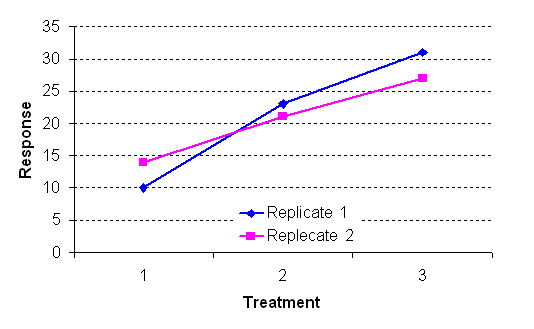 รูปที่ 2 กราฟแสดงค่า Response ของแต่ละ Treatment จากกราฟตามรูปที่ 2 เราสามารถที่จะค้นพบปรากฏการณ์ที่เราอาจจะได้ประโยชน์สูงสุดและสามารถนำไปใช้ในการควบคุมกระบวนการได้ หรือในทางตรงกันข้ามเราอาจจะค้นพบวิธีที่เราอาจจะเสียประโยชน์มากที่สุดซึ่งจำเป็นต้องหลีกเลี่ยงก็ได้เช่นกัน