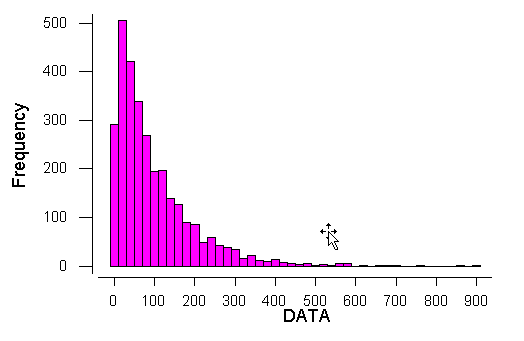 ตัวอย่าง มีข้อมูลอยู่ 3000 ข้อมูลซึงมีลักษณะการกระจายเป็นแบบ Exponential ที่มีค่าเฉลี่ย อยู่ที่ 100.0 เมื่อแสดงในรูป Distribution plot จะได้เป็นดังรูปกราฟต่อไปนี้
