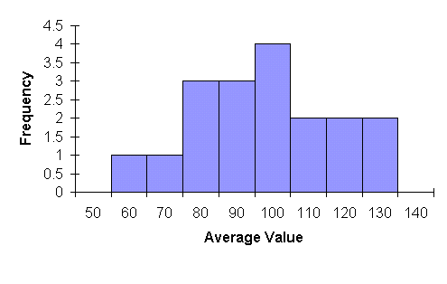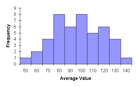 จะเห็นว่า ลักษณะการกระจายของค่าเฉลี่ยจะไม่เหมือนลักษณะการกระจายของประชากรแม่เลย คือมีแนวโน้มจะเป็น Normal distribution แต่ค่าเฉลี่ย ของข้อมูลใหม่นี้จะยังเท่าเดิมกับค่าของประชากรแม่อยู่ แต่ถ้าเพิ่มจำนวนการเก็บตัวอย่างไปเป็น 40 ครั้ง หรือมีค่า เฉลี่ยของตัวอย่างอยู่ทั้งหมด 40 ค่ากราฟที่ได้จะเป็นดังต่อไปนี้