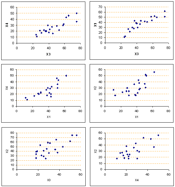 ตารางที่ 2 ผลการวิเคราะห์ Multiple regression โดยโปรแกรม Excel จะรู้ได้อย่างไรว่าเกิด Collinearity หรือ Multicollinearity ขึ้นแล้วเมื่อเราทำการวิเคราะห์ข้อมูลโดย Multiple regression วิธีที่ 1 ง่ายที่สุดคือดูจากค่า F- Significane ของ Model (Regression) จากตาราง ANOVA และค่าทดสอบทางสถิติของสัมประสิทธิ์ตัวแปรอิสระแต่ละตัว โดยที่หาก F-Significane น้อยกว่า a (0.05) แปลว่า Regression model ดังกล่าวมีค่านัยสำคัญ แต่ถ้าค่าทดสอบทางสถิติของสัมประสิทธิ์ตัวแปรอิสระทั้งหมด หรือบางตัวไม่มีนัยสำคัญ (P-Value มากกว่า a ) แปลว่ามีโอกาสเกิด Collinearity ระหว่างตัวแปรอิสระอย่างมากทีเดียว จากตารางที่ 2 เมื่อวิเคราะห์ Multiple linear regression โดยโปรแกรม Excel ตามขั้นตอนปกติ จะพบว่าค่า F-Significance บ่งบอกว่า Regression model มีนัยสำคัญ แต่เมื่อดู P-Value ของ X3 บ่งบอกว่า X3 ไม่มีนัยสำคัญต่อ Regression model เลยหรือบอกว่า ไม่จำเป็นต้องมี X3 เลยก็ได้ ลักษณะเช่นนี้คือมีโอกาสเกิด Collinearity สูงมาก จริงหรือที่ไม่จำเป็นต้องมี X3 ใน Model ที่ได้ วิธีที่ 2 ใช้ Scatter plot ระหว่างตัวแปรอิสระทุกกคู่ จากรูปที่ 1 จะพบว่า คู่ X3,X4 คู่ X1,X3 และคู่ X1,X4 มีความสัมพันธ์กันอย่างมากทีเดียว ในขณะที่คู่อื่นๆที่เหลือก็่มีความสัมพันธ์เชิงเส้นต่อกันเองพอสมควรทีเดียว โดยดูจากแนวการเรียงตัวของจุด กราฟที่ได้บ่งบอกว่าเกิด Multicollinearity ขึ้นแล้ว รูปที่ 1 ตัวอย่าง Scatter plot ระหว่างตัวแปรอิสระ 6 คู่ วิธีที่ 3 ทดสอบหาค่าสหสัมพันธ์ระหว่างตัวแปรอิสระแต่ละตัวกับตัวแปรตามและกับตัวแปรอิสระตัวอื่นๆ