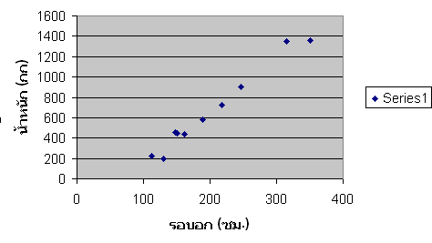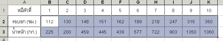 การทำ Linear regression model fitting โดยใช้โปรแกรม Microsoft Excel เนื่องจาก Excel จัดเป็นโปรแกรมที่มีคนใช้งานเยอะและง่ายต่อการใช้งานและ ผู้เขียนคิดว่าผู้อ่านคงจะเคยใช้มาก่อน และมีความชำนาญพอประมาณ ผู้เขียนเลยขอใช้ Excel ในการหา Regression model หรือที่เรียกว่า Model fitting โดยปกติเมื่อเก็บข้อมูลมาแล้ว ก็คงต้องใช้โปรแกรมคอมพิวเตอร์ช่วยในการวิเคราะห์หรือพล๊อตกราฟให้ ในการหา Model ที่ดีที่สุดก็เช่นเดียวกัน มีวิธีทำตามขั้นตอนต่อไปนี้ จากข้อมูลของตัวอย่างในเรื่อง Regression Analysis ดังตาราง ขั้นตอนที่ 1 เมื่อเตรียมข้อมูลในตารางแล้ว เริ่มด้วยการใช้ Mouse เลือกข้อมูลที่จะไปเป็น X,Y ดังรูปที่ 1
