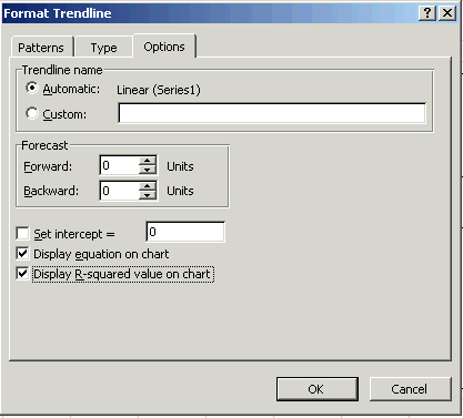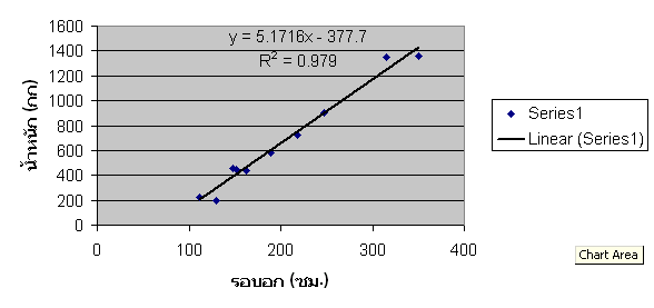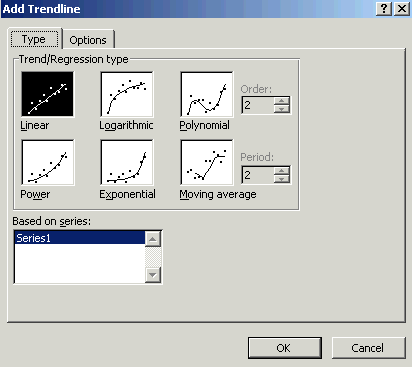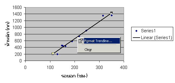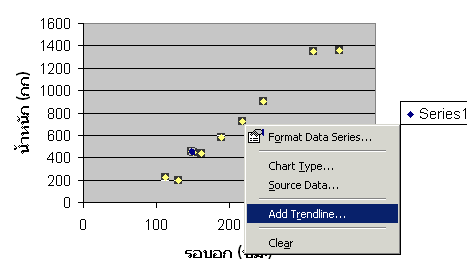 รูปที่ 6 ขั้นตอนที่ 6 เลื่อน mouse cursor ไปแตะจุดที่เรียงตัวกันอยู่ จุดใดจุดหนึ่งก็ได้ จากนั้นให้ Click ขวาที่ Mouse จุดจะเปลี่ยนเป็นสีเหลือง พร้อมกับปรากฏเมนูย่อยๆ ขึ้นมาให้เลือก Add Trendline ก็จะปรากฏหน้าต่างใหม่ดังรูปที่ 8 เช็คดูว่าตรงกราฟ Linear มีสีดำ (แปลว่าเลือก) จากนั้นให้กด OK