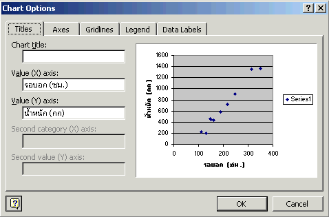รูปที่ 4 ขั้นตอนที่ 5 เมื่อปรากฏหน้าต่างใหม่ขึ้นมาดังรูปที่ 5 ให้พิมพ์ข้อความที่จะปรากฏตามต้องการแล้วกด OK จะได้กราฟดังรูปที่ 6