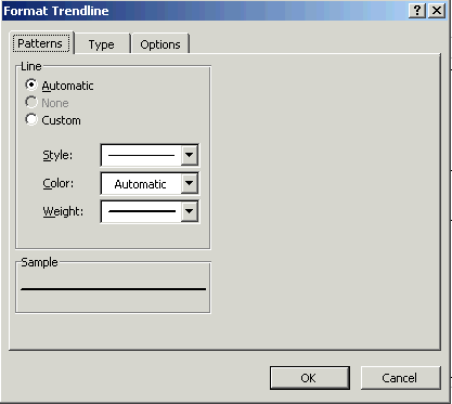 รูปที่ 8 ขั้นตอนที่ 7 เลื่อน mouse cursor ไปแตะกับเส้นตรงที่ปรากฏขึ้นเมื่อเสร็จขั้นตอนที่ 6 จากนั้นให้ Click ขวาที่ Mouse จะปรากฏจุดสีเหลืองที่ปลายเส้นตรงทั้งสองด้าน พร้อมกับปรากฏเมนูย่อยๆ ขึ้นมาให้เลือก Format Trendline ก็จะปรากฏหน้าต่างใหม่ดังรูปที่ 10 ให้กดเลือก Option จะเห็นหน้าต่างเป็นดังรูปที่ 11