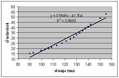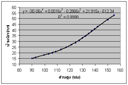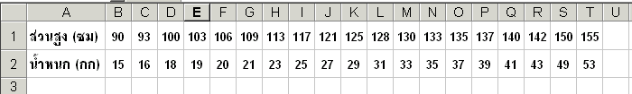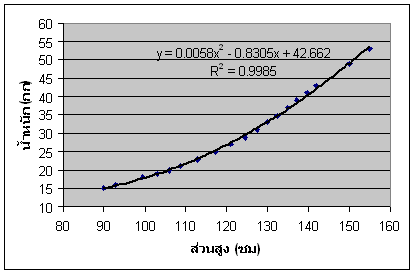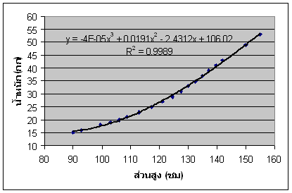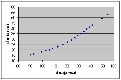 การทำ Polynomial regression model fitting โดยใช้โปรแกรม Microsoft Excel ต่อเนื่องจากการทำ Linear regression model fitting ซึ่งโดยปกติ ก็มักจะพบอยู่เสมอที่ความสัมพันธ์ระหว่างตัวแปร X,Y ไม่เป็นเชิงเส้น เมื่อทำ Scatter plot ดูแล้วจะเห็นจุดเรียงเป็นแนวโค้ง ซึ่งก็มีหลายระดับหรือหลายดีกรีความโค้งอีกด้วย ตัวอย่าง 1 ต้องการหา Regression model ความสัมพันธ์ของค่าน้ำหนักและส่วนสูงของ เด็กชายไทย อายุระหว่าง 1-9 ขวบ โดยมีข้อมูลที่ได้จากการวิจัยและเก็บรวบรวมค่าไว้ ดังตัวอย่างในตารางนี้