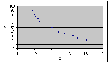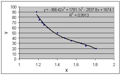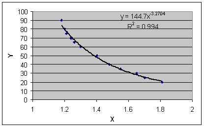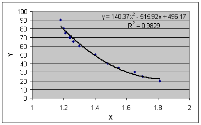 จากการทำ Scatter plot ข้อมูลจากตารางจะได้ กราฟดังรูปที่ 7 จะเห็นว่าแนวของจุดจะเป็นเส้นโค้งลง ไม่เป็นเชิงเส้นแน่นอน