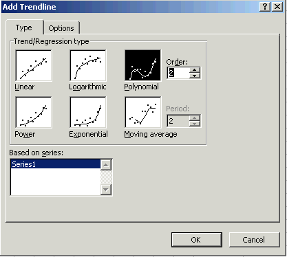 รูปที่ 1 เมื่อถึงขั้นตอน Add trendline ถ้าเราเลือกชนิดเป็น Linear เพื่อลองหา Model ดู กด OK เมื่อเลือกเสร็จแล้ว