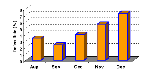 จากตัวอย่าง เป็นกราฟที่ใช้อธิบายอัตราการเกิดขึ้น ของของเสียใน 5 เดือน สาระที่สำคัญไม่ได้อยู่ที่ว่าแต่ละเดือนมีของเสียเกิดขึ้นเท่าไหร่ แต่อยู่ตรงที่ 3 เดือนที่ผ่านมาแนวโน้มจะเกิดของเสียจากกระบวนการผลิต เพิ่มขึ้นเรื่อยๆ ผู้ที่มีหน้าที่รับผิดชอบจะต้องหาทางแก้ไข Box Plotใช้แสดงสาระที่สำคัญของข้อมูลคือ ค่ากลาง ค่าการกระจาย สัดส่วนข้อมูลที่มากหรือน้อยกว่าค่ากลาง ( Symmetry ) รวมทั้งข้อมูลที่อยู่ห่างจากกลุ่มมากๆ (Outlier)