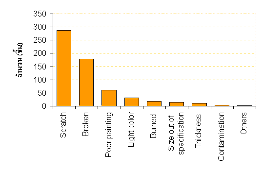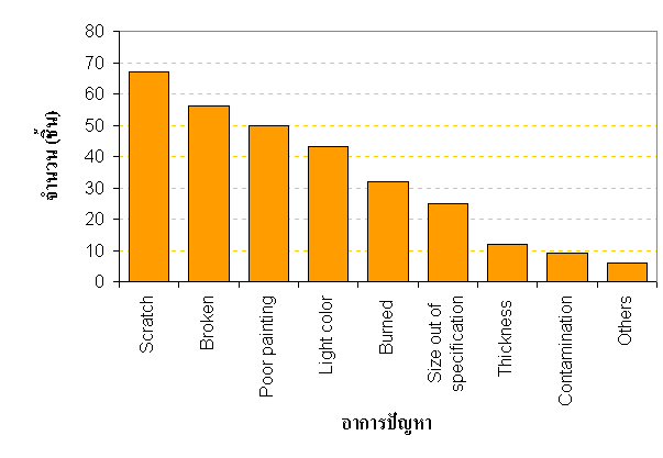 เมื่อนำข้อมูลมาพล้อตด้วยกราฟแท่ง เราจะได้ Pareto chart ดังนี้