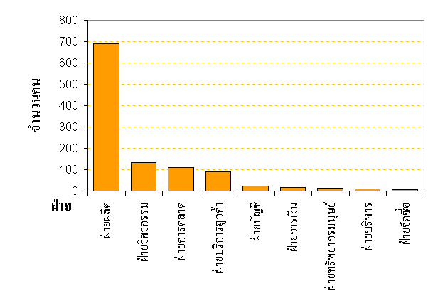 จากกราฟ จะเห็นว่าอาการของปัญหา สองปัญหาแรกเป็นสาเหตุที่ทำให้เกิดงานเสียรวมกัน 76.7 % ปัญหาที่เหลือเป็นเพียงส่วนน้อยเท่านั้น สาระที่ได้จาก Pareto chart นี้คือ ผู้ที่รับผิดชอบจะต้องดำเนินการเพื่อลดปัญหาสองอย่างนี้ให้ได้เสียก่อน เพราะถือว่ามีความจำเป็นเร่งด่วน เพียงแค่สามารถลดปัญหาทั้งสองลงได้แค่ครึ่งเดียวของแต่ละปัญหา ก็สามารถลดปริมาณงานเสียรวมลงได้กว่า 40% ทีเดียว ความเข้าใจผิดในการใช้ Pareto chart 1. ใช้ Pareto chart อธิบายข้อมูลที่ไม่มีการเปลี่ยนแปลง ดังรูปต่อไปนี้เป็นกราฟที่อธิบายจำนวนพนักงานแต่ละแผนกของบริษัทแห่งหนึ่ง