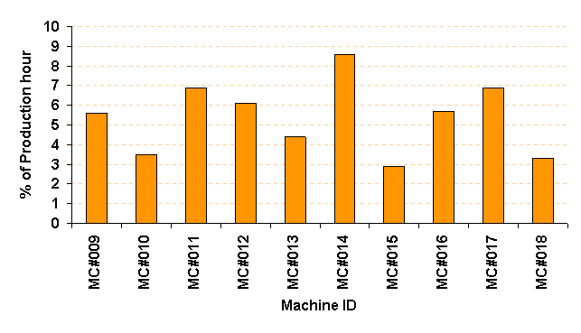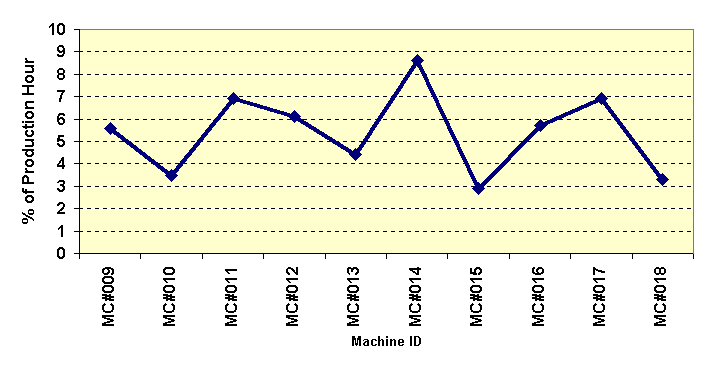 เป็นการเลือกกราฟที่ผิดชนิดอย่างมาก เพราะเหตุคือ กราฟที่เขาใช้เป็น Time Series Plot ประเภทหนึ่ง ซึ่งจะใช้ได้ก็ต่อเมื่อ แกน X เป็นข้อมูลเวลา และให้ความรู้สึกว่าแต่ละหน่วยในแกน X ต้องมีความสัมพันธ์กัน เช่น เวลา สัมพันธ์กัน คือเวลาทางขวามือจะเกิดขึ้นตามเวลาทางซ้ายมือเสมอ แต่กรณีนี้ แกน X เป็น หมายเลขประจำตัวเครื่อง แต่ละหมายเลขเครื่องไม่สัมพันธ์กัน หรืออิสระต่อกัน ดังนั้นเมื่อเชื่อมโยงแต่ละจุดเข้าด้วยกันเป็นกราฟเส้นต่อเนื่อง จึงไม่มีสาระเลย ถ้าข้อมูลข้างบนเปลี่ยนมาใช้กราฟแท่ง จะเป็นแบบนี้