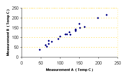 จะเห็นว่า กรณีตัวอย่างนี้ไม่เหมือนกับตัวอย่างแรก เพราะ Measurement A หรือ B ต่างก็อิสระต่อกัน ไม่ได้เป็น เหตุหรือผล ต่อกันและกัน จึงไม่มี Predictor หรือ Respones นั่นแปลว่า เราสามารถสลับข้อมูลในแนวแกน X หรือ แกน Y ในการทำ Scatter plot หากระบบการวัดทั้งสองให้ค่าวัดได้ตรงกัน แนวของจุดตัดจะเรียงกันเป็นเส้นตรง และมีค่าความเอียง 45 องศาพอดี แต่ผลจากการใช้ Scatter plot สามารถชี้ให้เห็นว่า เกิดความแตกต่างกันขึ้น ระหว่างระบบการวัดสองระบบ แล้วจะต้องเลือกใช้ระบบไหนถึงจะถูกต้องที่สุด หรือความแตกต่างดังกล่าว สามารถยอมรับได้หรือไม่ นั่นคือสิ่งที่จะต้องหาคำตอบต่อไป