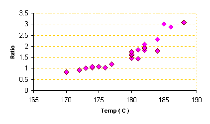 Scatter Plot จากที่ผ่านมา เป็นกราฟที่แสดงข้อมูลเพียงหนึ่งตัวแปรเท่านั้น (Univariated data plot) แต่ในบางครั้งเวลาเราจำเป็นที่จะต้องศึกษาตัวแปรสองตัว พร้อมๆกัน เช่น อาจจะศึกษาความสัมพันธ์ของตัวแปรสองตัว ข้อมูลที่เราได้จากการศึกษาก็จะมีสองข้อมูล (Bivariated data) หากเราจำเป็นที่สร้างกราฟเพื่อดูความสัมพันธ์ เราจะใช้ Scatter plot Scatter plot เป็นกราฟ ที่นำเอาจุดตัดกันของค่าในแนวแกน X และแกน Y ของทั้งสองข้อมูลมาแสดง ตัวอย่าง วิศวกร ได้บันทึกอัตราส่วนระหว่างปริมาณสารเคลือบผิวและเนื้อโลหะที่สูญหายไป (Ratio) เมื่อทำการเปลี่ยนอุณหภูมิของถังชุบไป ได้ข้อมูลดังตารางต่อไปนี้