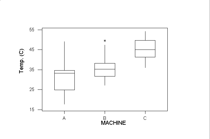 นอกจากนั้นเรายังสามารถใช้ Box plot เพื่อเปรียบเที่ยบระหว่างข้อมูลสองกลุ่มหรือมากกว่าก็ได้ ดังตัวอย่างต่อไปนี้ เป็นการเก็บข้อมูลเรื่องอุณหภูมิของน้ำหล่อเย็นที่ออกจากเครื่องจักรสามเครื่อง กำลังจะปล่อยลงสู่แหล่งน้ำธรรมชาติ
