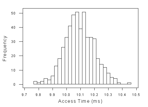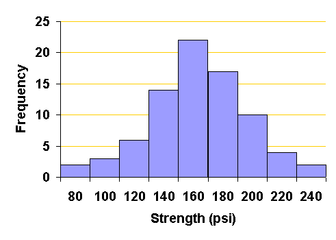 เราจะพบว่า MACHINE A ให้ค่าต่ำที่สุด ในขณะที่ C สูงที่สุด แต่ A ก็มีการกระจายมากที่สุดเช่นกัน นี่เป็นตัวอย่างการนำไปใช้งานและการวิเคราะห์สาระที่ได้จากการใช้ Box plot Histogram เป็นกราฟที่ใช้แสดงการกระจายของข้อมูล ความถี่ในการเกิดเหตุการณ์ที่เราสนใจ โดยแนวแกน x คือค่าหรือสิ่งที่เราสนใจ โดยจะถูกแบ่งออกเป็นช่วงๆ ส่วนแกน Y คือความถี่ในการเกิดค่านั้นๆ ดังตัวอย่างต่อไปนี้