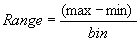 โดยที่ max คือค่าสูงสุดของข้อมูล min คือค่าต่ำสุด และ bin คือจำนวนแท่ง ที่เราหาใได้ตามข้อ 1 ตัวอย่าง ค่าสูงสุดของข้อมูลคือ 245 ค่าต่ำสุดคือ 76 ผลต่างคือ 245 - 76 = 169 หน่วยเรากำหนดว่ากราฟจะมี 9 แท่ง ดังนั้น range = 169/9 =18.77 เราเลือกที่ 20 หน่วย โดยที่ค่าต่ำสุดของแท่งแรกจะต้องเปลี่ยนมาเป็น 70 และค่าบนสุดของแท่งสุดท้ายจะเป็น 250 3. นับจำนวนข้อมูลที่มีค่าตกอยู่ในแต่ละย่าน ( bin ) โดยสามารถทำเป็นตารางความถี่ได้ดังนี้