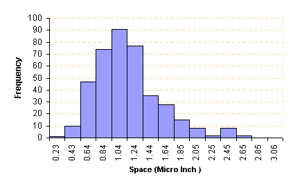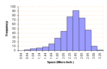 โดยที่ในแกน X ค่าที่ปรากฏจะเป็นค่ากลางของแต่แท่งกราฟ นั่นเอง แต่สามารถบอกค่าแรกของกลุ่มก็ได้ เมื่อเราใช้ Histogram แสดงลักษณะการกระจายของข้อมูล ก็เป็นไปได้ว่า Histogram จะมีรูปแบบ ที่ไม่เหมือนกันเสมอไป ขึ้นอยู่กับการกระจายตัวของข้อมูลนั้น ดังตัวอย่างต่อไปนี้เป็นการเปรียบเทียบให้เห็นลัษณะของ Histogram ที่อาจจะเป็นไปได้ โดยสมมุติว่าข้อมูลที่นำมาทำ Histogram ทั้งสองมาจาก สายการผลิตเดียวกัน เป็นการประกบชิ้นงานสองชิ้นงานเข้าด้วยกัน แล้วหาช่องว่างที่เกิดขึ้น จากเครื่องที่ทำหน้าที่ประกอบ สองเครื่องโดยหน่วยที่ใช้วัดเป็น หนึ่งส่วนล้านนิ้ว (Micro Inch) โดยค่ายิ่งต่ำยิ่งดี