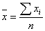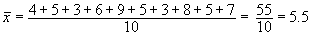 โดยที่ Xi คือค่าของข้อมูลใดๆ และ n คือจำนวนของข้อมูลทั้งหมด ตัวอย่าง มีข้อมูลอยู่ 10 ข้อมูล ดังนี้ 4 5 3 6 9 5 3 8 5 7 ค่าเฉลี่ย คือ