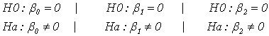 ขั้นตอนที่ 4 ทดสอบสมมติฐาน เพื่อหาว่าค่า b0,b1 และ b2 ที่หามาได้นั้นมีนัยสำคัญความแตกต่างกับ 0 หรือไม่ พูดง่ายๆคือจำเป็นต้องคงค่า หรือพจน์ที่ค่านี้คูณอยู่ไว้ใน Model หรือไม่ โดยสมมติฐานที่ต้องทดสอบคือ