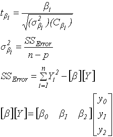 ในการทดสอบ จะใช้ T -Statistics ทั้งนี้เพราะเรา Assume ว่า ค่า b0, b1 และ b2จะเป็น Normal distribution รอบๆค่ากลางค่าหนึ่ง เรากำลังจะทดสอบว่าค่ากลางดังกล่าวเท่ากับ 0 หรือไม่ โดยสมการในการหาค่า T เป็นดังนี้ (ผู้เขียนขอไม่อธิบายที่มาของสมการ)