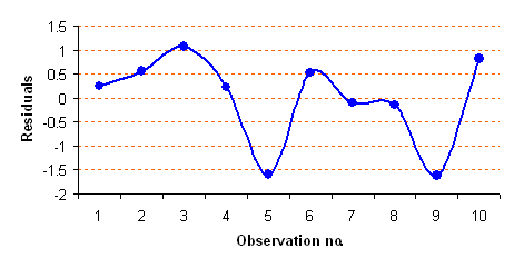 จะพบว่า แนวของจุดถือได้ว่า ไม่มีทิศทางใดแน่นอน ไม่ได้อยู่ทางด้านลบหรือบวกอย่างเดียว ไม่ได้ขึ้นหรือลงอย่างเดียว ลักษณะเช่นนี้เราถือว่าความเป็นอิสระของ X แต่ละตัวอยู่ในเกณฑ์ที่ยอมรับได้ (กรณี Multiregression Analysis โปรแกรม Excel ไม่ได้พล้อตให้ ท่านจำเป็นต้องทำเอง) - Homoscedasticity