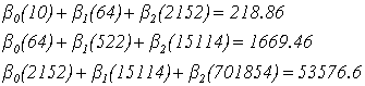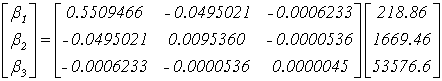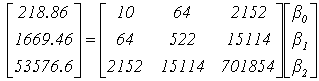 วิธีที่สามารถใช้ในการแก้สมการ เพื่อหาค่า b0,b1 และ b2 นั้นมีอยู่หลายวิธี แต่ผู้เขียนขอเลือกใช้วิธี Matrix ในการแก้สมการเพื่อหาคำตอบ ซึ่งท่านสามารถอ่านวิธีการ Matrix เพื่อเป็นตัวอย่างได้ ทางนี้ <<< Link To Matrix >>> ขั้นตอนที่ 3 เปลี่ยนสมการให้อยู่ในรูป Matrix แล้วใช้วิธีการทาง Matrix ในการหาค่า b0,b1 และ b2 จะได้สมการในรูป