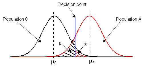 เพื่อให้มองเห็นภาพของคำว่าความเสี่ยง ของทั้งสองแบบ รูปข้างล่างนี้จะอธิบายได้ดีขึ้น ในทางตรงกันข้าม บริเวณ b ที่จริงแล้วข้อมูลที่เก็บมาได้เป็นข้อมูลของ Population A แล้ว แต่เนื่องจากเป็นส่วนปลายๆ ของ Population A และเป็นส่วนคาบเกี่ยวของทั้งสองประชากร ทำให้ไม่แน่ใจ เลยทำให้สรุปว่า เป็นส่วนของ Population 0 อยู่ รูปอธิบาย ความแตกต่างวิกฤตของสองประชากร ( d หรือ D )