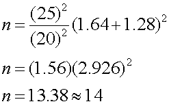 แทนในสมการ ตัวอย่าง 1 เครื่องจักรตัดแท่งโลหะเครื่องหนึ่ง ตัดแท่งโลหะแล้วมีค่าความยาวเฉลี่ย 30.05 เซนติเมตร และค่าความเบี่ยงเบนมาตรฐานที่ผ่านมาอยู่ที่ 1.40 เซนติเมตร เมื่อต้องทำการเปลี่ยนชิ้นส่วน นายช่างต้องการทดสอบสมมติฐานว่า ก่อนและหลังเปลี่ยนชิ้นส่วน ผลการตัดแท่งโลหะจะผิดเพี้ยนไปจากเดิมหรือไม่ โดยต้องการความเชื่อมั่นในการทดสอบ 95% และต้องการ Power of the test ที่ 90% ขึ้นไป โดยถ้าก่อนและหลังเปลี่ยนชิ้นส่วนอะไหล่ ยังตัดแท่งโลหะได้ความยาวเท่าเดิม หรือผิดพลาดไม่เกิน 1 เท่าของค่าความเบี่ยงบนมาตรฐาน จะถือว่าเครื่องจักรนั้นผ่านการทดสอบ หาสมมติฐานของโจทย์ ต้องการทดสอบความแตกต่างของค่าเฉลี่ย โดยเป็นการทดสอบแบบสองด้าน (2 Sided test) โดยผู้ทำการทดสอบจะต้องเก็บข้อมูลก่อนและหลังเปลี่ยนชิ้นส่วนอะไหล่ของเครื่องจักร ดังนั้น สมมติฐาน จะเป็น Ho: ความยาวแท่งโลหะ ก่อนและหลังเปลี่ยนชิ้นส่วนไม่แตกต่างกัน Ha: ความยาวแท่งโลหะ ก่อนและหลังเปลี่ยนชิ้นส่วนแตกต่างกัน จาก โจทย์เราทราบว่า 1*s = D a=0.05, a/2=0.025 จากตาราง Z0.025 = 1.96 b = 0.1 จากตาราง Z0.1 = 1.28