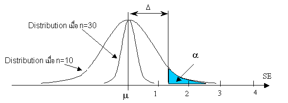 นั่นคือ ผู้ทำการทดสอบจะต้องใช้จำนวนข้อมูลก่อนและหลังเปลี่ยนชิ้นส่วนอะไหล่ 11 ข้อมูล (ตัวอย่าง หรือ แท่งเหล็ก ) ตัวอย่าง 2 วิศวกรต้องการปรับปรุงเครื่องจักรที่ทำการบรรจุปูนซิเมนต์ชนิดถุง เพื่อให้สามารถได้ผลผลิตต่อชั่วโมง (Unit per hour) เพิ่มขึ้น โดยปกติที่ผ่านมาพบว่าเครื่องจักรเครื่องนี้สามารถผลิตได้ 410 ถุงต่อชั่วโมง โดยมีค่าความเบี่ยงเบนมาตรฐานอยู่ที่ 25 ถุงต่อชั่วโมง ผู้ผลิตชิ้นส่วนเจ้าหนึ่งอ้างว่า ถ้าเปลี่ยนมาใช้อะไหล่ของเขา จะทำให้ความสามารถของเครื่องจักร เพิ่มขึ้นอีก 20 ถุงต่อชั่วโมงเป็นอย่างต่ำ อยากทราบว่าจะต้องเก็บตัวอย่างก่อนและหลังปรับปรุงเครื่องจักรจำนวนเท่าใด ถึงจะเพียงพอ ถ้าต้องการความถูกต้อง 95% และ Power of the test 90% เพื่อจะตอบตกลงซื้อหรือไม่ซื้อชิ้นส่วนจากผู้ผลิตเจ้านี้ จากโจทย์ เราสามารถตั้งสมมติฐานได้ว่า Ho: Unit per hour ก่อนและหลังเปลี่ยนชิ้นส่วนไม่แตกต่างกัน Ha: Unit per hour หลังเปลี่ยนชิ้นส่วนมากกว่าก่อนเปลี่ยน เป็น