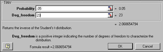 4. หา degree of freedom df = n-1 = 24-1 = 23 5. หาค่า t0.025,23 โดยเปิดตาราง T-Distribution ได้ tcritical = 2.069 หรือใช้ MS Excel