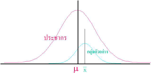 จากรูปข้างบนเป็นภาพอธิบายเปรียบเทียบ การกระจายของข้อมูลของประชากรและของกลุ่มตัวอย่าง เพื่อให้เห็นว่ากลุ่มตัวอย่าง จะมีความใกล้เคียงกับประชากร มาก ภายใต้เงื่อนไข การเก็บตัวอย่างที่ถูกต้อง สิ่งที่ใช้อธิบายประชากรเราจะเรียกว่า Population Parameter ส่วน ของกลุ่มตัวอย่างเราจะเรียกว่า Sample Statistics