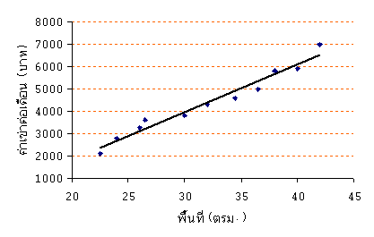 โดยใช้สมการ ค่าเช่าต่อเดือน = -2487.47 + 214.52 x พื้นที่ห้อง จะเห็นว่า เขาสามารถที่จะประมาณได้ว่า ห้องที่มีขนาดพื้นที่แตกต่างกัน ควรจะจะกำหนดราคาเช่าต่อเดือนเท่าใด ทั้งๆที่ ข้อมูลในตารางนี้เขาไม่ได้เก็บข้อมูลมาก่อน แต่เมื่อเขามีสมการความสัมพันธ์ระหว่าง พื้นที่ห้องกับค่าเช่ารายเดือน เขาก็สามารถที่จะนำไปใช้คาดการณ์ได้