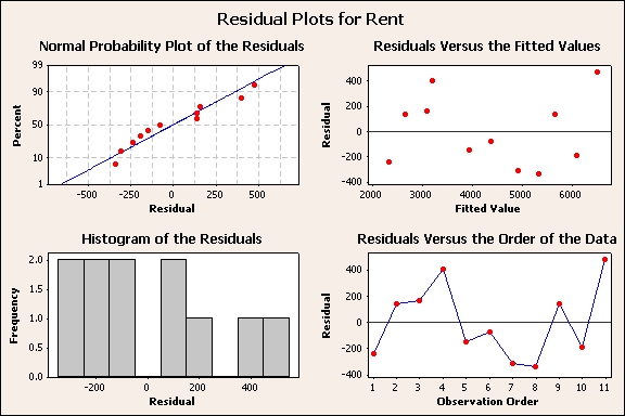 เมื่อเรา Verify ข้อมูล โดยใช้กราฟ 3 ข้อมูล ก็ยืนยันว่าข้อมูลที่เก็บมานั้นผ่านเกณฑ์หรือเงื่อนไขที่สำคัญ ถ้าใช้ โปรแกรม Minitab จะได้ผลการวิเคราะห์ดังนี้ Regression Analysis: Rent versus Area The regression equation is Rent = - 2487 + 215 Area