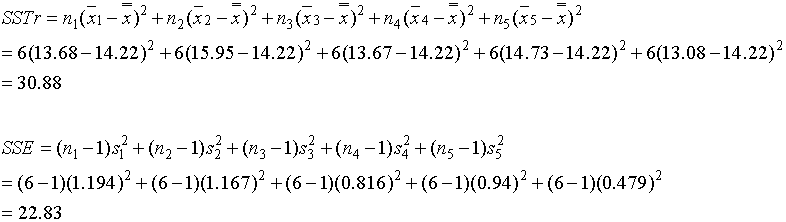 หากโจทย์ข้อนี้เราวิเคราะห์โดยใช้โปรแกรม Minitab จะให้ผลดังนี้ One-way ANOVA: Brand 1, Brand 2, Brand 3, Brand 4, Brand 5 Analysis of Variance Source DF SS MS F P Factor 4 30.855 7.714 8.44 0.000 Error 25 22.838 0.914 Total 29 53.694
