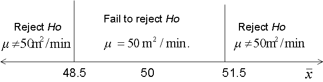 ค่าตั้งแต่ 48.5 จนถึง 51.5 เราถือว่าเป็นย่านที่ยอมรับ Ho หรือ ไม่สามารถปฏิเสธ Ho ได้ เราเรียกว่า Acceptance region ค่า 48.5 และ 51.5 ซึ่งเป็นจุดแบ่งระหว่างการยอมรับและปฏิเสธ Ho เราเรียกว่าค่าวิกฤติ ( Critical values ) ย่านที่ค่าน้อยกว่า 48.5 และมากกว่า 51.5 เราถือว่าเป็นย่านที่ปฏิเสธ Ho หรือเรียกว่า Critical region แต่ในบางครั้งเราก็อาจจะปฏิเสธสมมติฐานหลัก หรือ Reject Ho ทั้งๆที่จริงๆแล้วค่าเฉลี่ย m (ของประชากร) ยังเท่ากับ 50 m2/min อยู่ แต่ด้วยเป็นเพราะค่าตัวอย่างที่เราไปสุ่มมามีโอกาสที่จะได้เกาะกลุ่มกันอยู่ค่าที่เมื่อหาค่าเฉลี่ยแล้ว ตกอยู่ในย่านปฏิเสธ Ho แสดงว่าเราตัดสินใจผิด เราเรียกเหตุการณ์กรณีนี้ว่า ความผิดพลาดประเภทที่ 1 ( Type I error) ในทางตรงกันข้ามบางครั้งเราก็ยอมรับสมมติฐานหลักว่าค่า m ยังเท่ากับ 50 m2/min อยู่ ทั้งๆที่ ค่าเฉลี่ยของประชากร ( m ) จริงๆเปลี่ยนไปแล้วและไปอยู่ในย่านปฏิเสธ Ho แล้ว แต่ด้วยการสุ่มเก็บค่าตัวอย่างทำให้ค่าเฉลี่ยของตัวอย่าง ( X ) ตกอยู่ในย่านยอมรับ Ho แสดงว่าเกิดการตัดสินใจผิดพลาด เราเรียกเหตุการณ์กรณีนี้ว่า ความผิดพลาดประเภทที่ 2 ( Type II error)