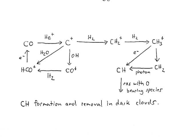 For example, C2H2 + C+ => C3H+ + H2 => C3H3+ + e- =>