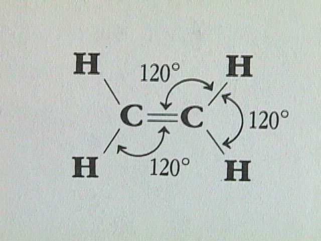 For alkanes, all the bond angles have the tetrahedral value of 109.5 degrees. In alkenes, the double bond results in only three bonding directions around each carbon atom, and therefore the bond angle is 120 degrees.