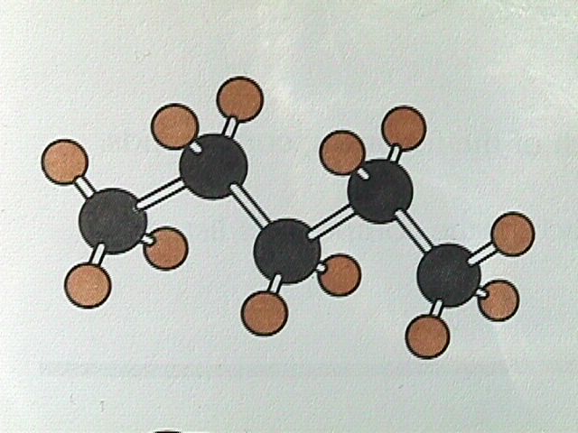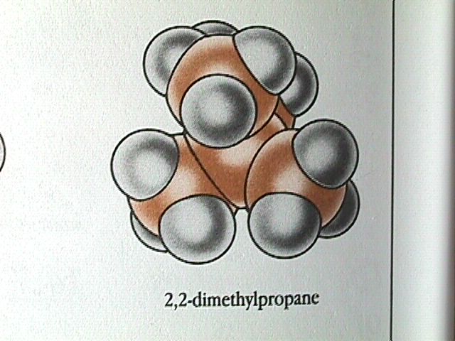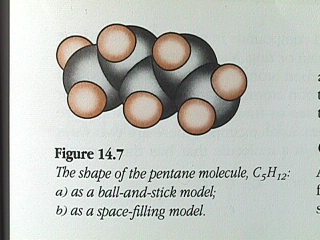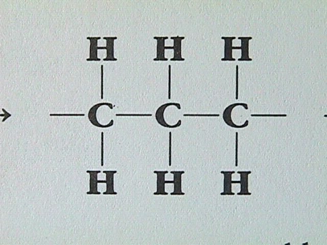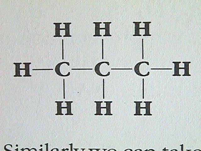Similarly, we could remove a hydrogen atom from ethane and replace it with another CH fragment to form propane, C H . This procedure can be repeated again and again to produce C H , C H , C H , etc. Because the angle between one carbon bonded to two others is always the tetrahedral angle of 109.5 degrees, a chain of carbon atoms will not form a straight line, but will be arranged in a zigzag manner.